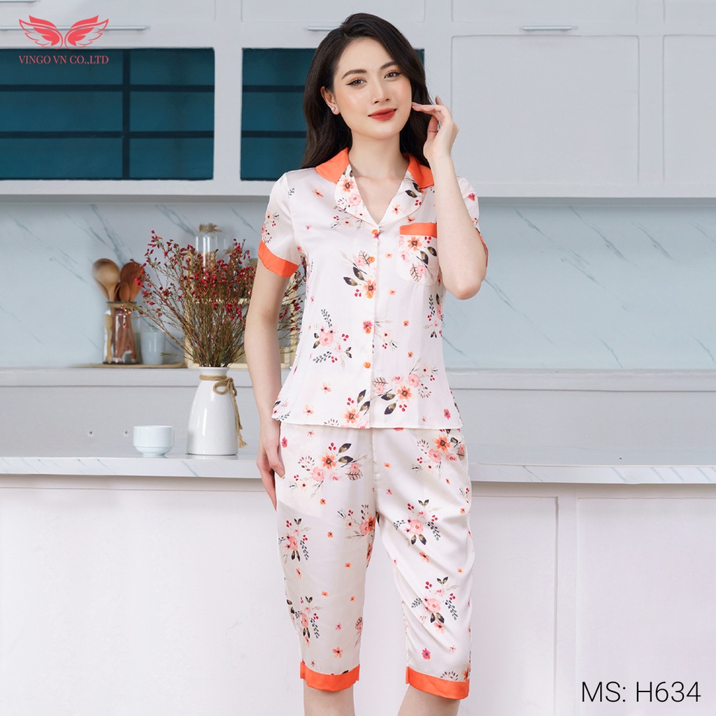 Đồ bộ nữ mặc nhà pijama lụa Pháp mềm mát mùa Hè VINGO thiết kế tay cộc quần lửng in chùm hoa màu cam nhã nhặn H634 VNGO