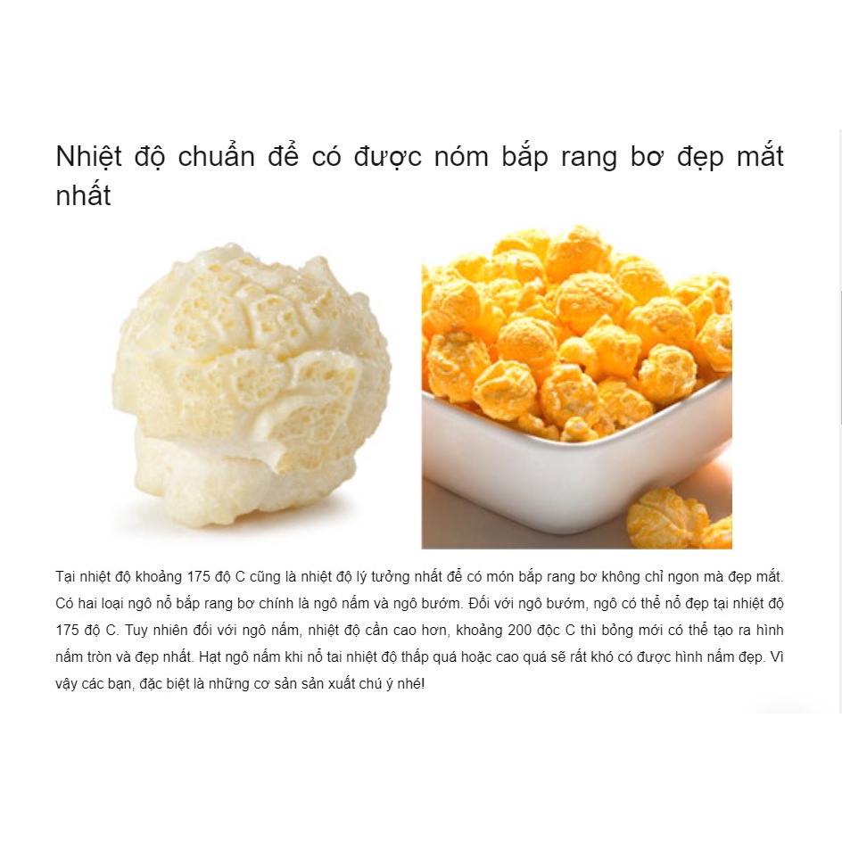 * Lưu ý: Nổ ngô nấm tận nhà cần căn nhiệt độ ổn định trên 200 độ hoặc dùng nồi nổ chuyên được vốn để làm hạt nổ ra được hình tròn trụ thích mắt.