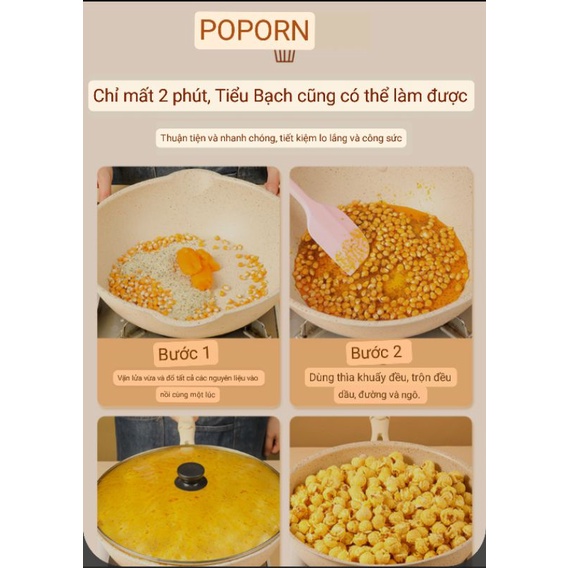-Bắp khởi đầu bung thì đậy nắp ,đồng thời lắc đều tỷ trọng bung tốt hơn và hạn chế việc cháy, dính chảo