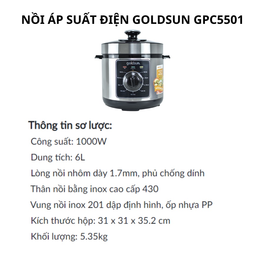 ⚡⚡⚡Nồi áp suất điện Goldsun GPC5501 Kích thước hộp: 31 x 31 x 35.2 cm (6 lít)